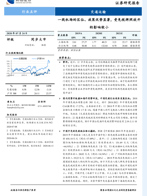 【财信证券】【20200724】一线机场的区位、政策优势显著,受免税牌照放开的影响较小-3页 行业研究