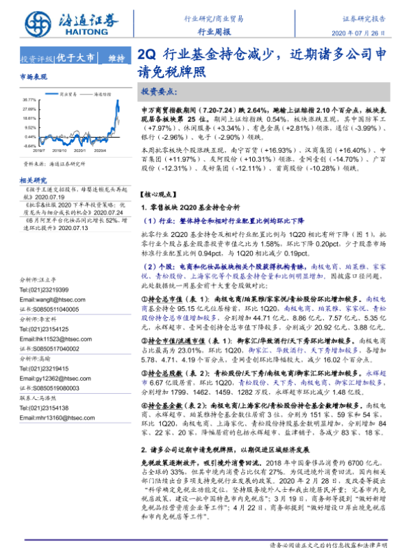 【海通证券】【20200726】商业贸易行业周报:2Q行业基金持仓减少,近期诸多公司申请免税牌照-8页 行业研究
