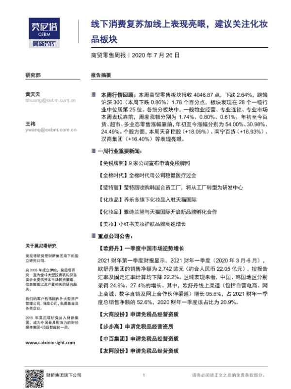 【莫尼塔研究】【20200726】商贸零售周报:线下消费复苏加线上表现亮眼,建议关注化妆品板块-8页 行业研究