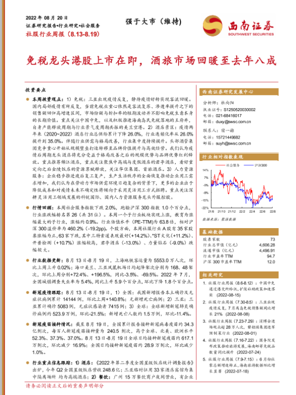 【西南证券】【20220820】社服行业周报:免税龙头港股上市在即,酒旅市场回暖至去年八成-22页 行业研究