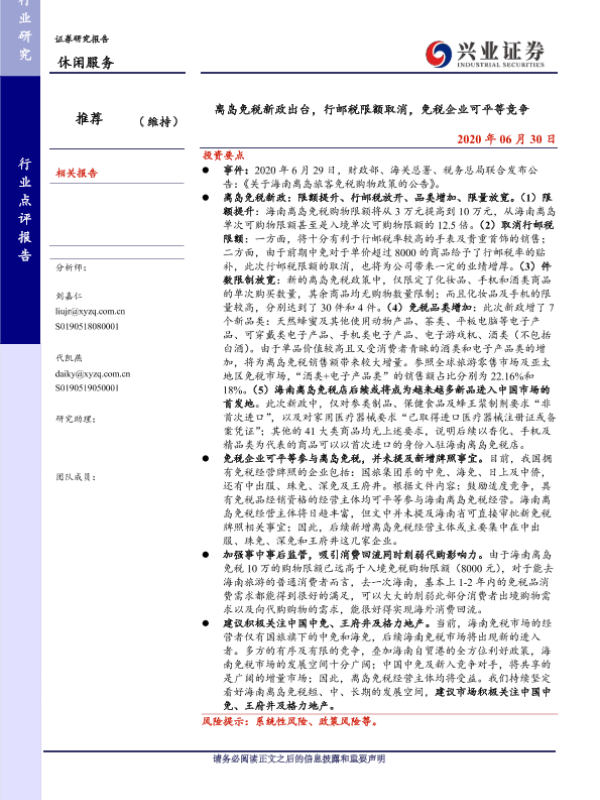 【兴业证券】【20200630】离岛免税新政出台,行邮税限额取消,免税企业可平等竞争-10页 行业研究