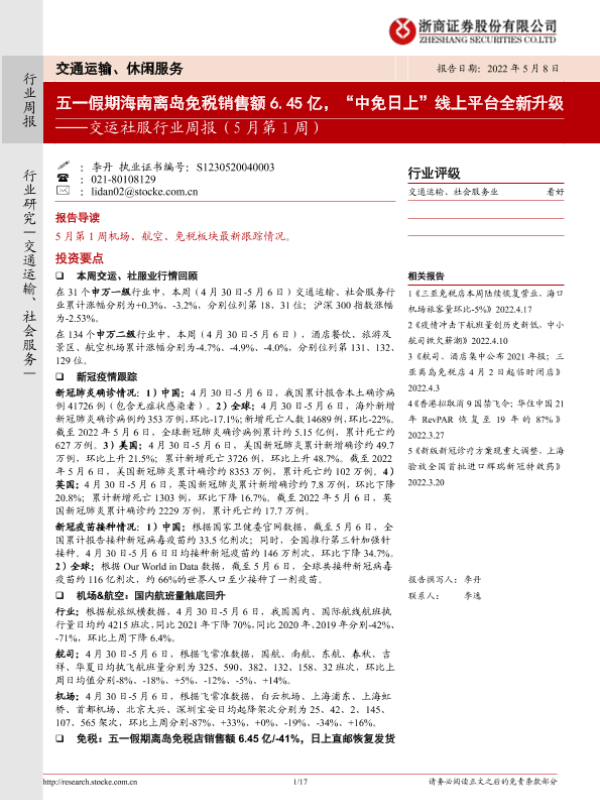【浙商证券】【20220508】交运社服行业周报:五一假期海南离岛免税销售额6.45亿,“中免日上”线上平台全新升级-17页 行业研究