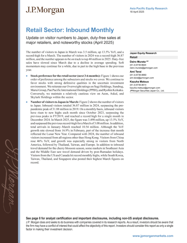 【J.P. Morgan】【20250418】Retail Sector Inbound Monthly Update on visitor numbers to Japan-13页 行业研究