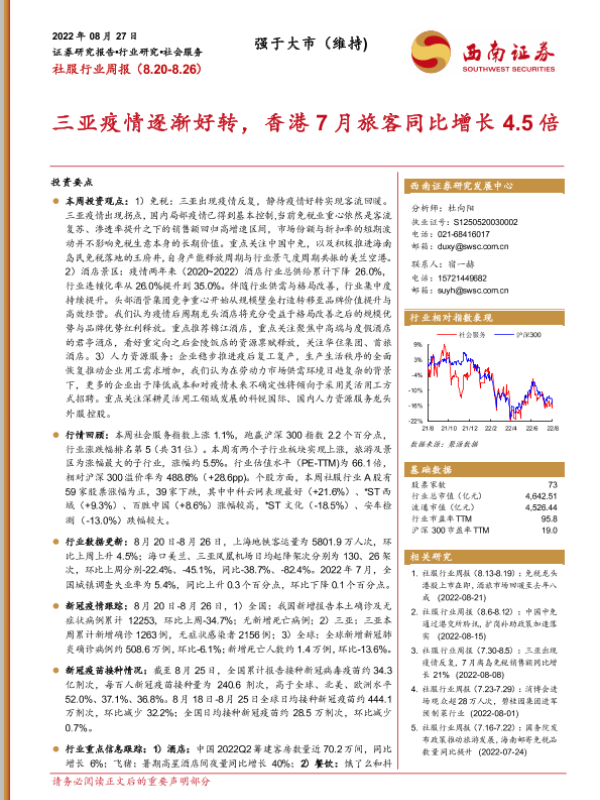 【西南证券】【20220827】社服行业周报:三亚疫情逐渐好转,香港7月旅客同比增长4.5倍-22页 行业研究