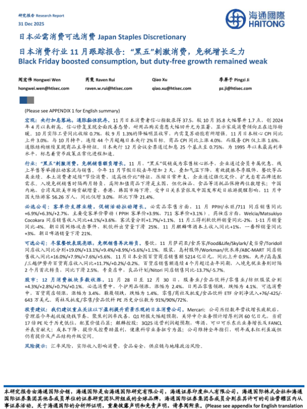 【海通国际】【202501】日本消费行业11月跟踪报告:“黑五”刺激消费,免税增长乏力-25页 行业研究