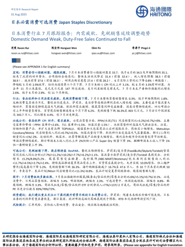 【海通国际】【202508】日本必需消费可选消费 Japan Staples Discretionary 日本消费行业 7月跟踪报告:内需疲软,免税销售延续调整趋势-24页 证券期货研究报告