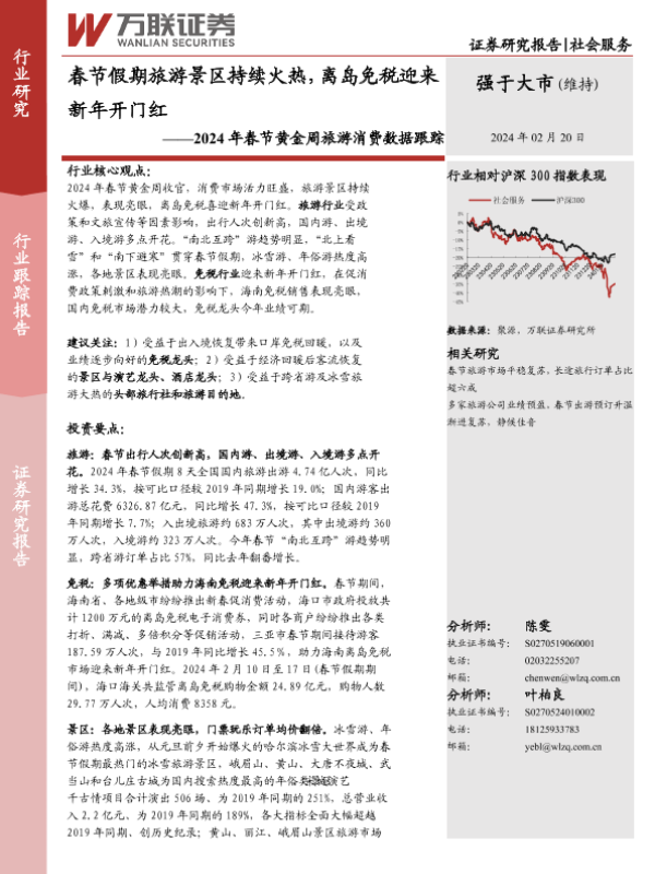 【万联证券】【20240220】社会服务:2024年春节黄金周旅游消费数据跟踪-春节假期旅游景区持续火热,离岛免税迎来新年开门红-10页 行业研究