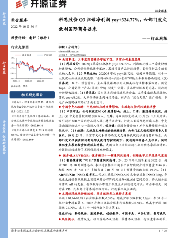【开源证券】【20221030】社会服务行业周报:科思股份Q3归母净利润yoy+324.77%,六部门发文便利国际商务往来-26页 行业研究