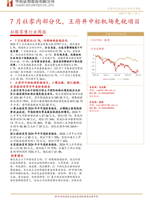 【华西证券】【20240818】社服零售行业周报:7月社零内部分化,王府井中标机场免税项目-14页 行业研究