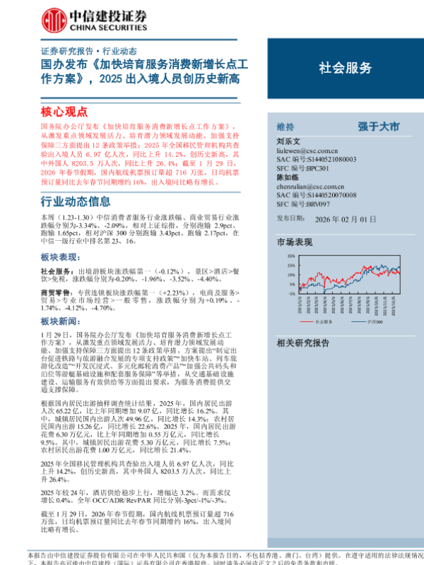 【中信建投证券】【202602】社会服务行业动态:国办发布《加快培育服务消费新增长点工作方案》,2025出入境人员创历史新高-30页 证券期货研究报告