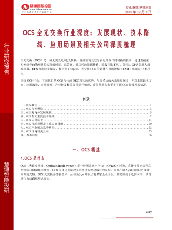 【慧博智慧博】【2025】OCS全光交换行业深度:发展现状、技术路线、应用场景及相关公司深度梳理-27页 行业研究