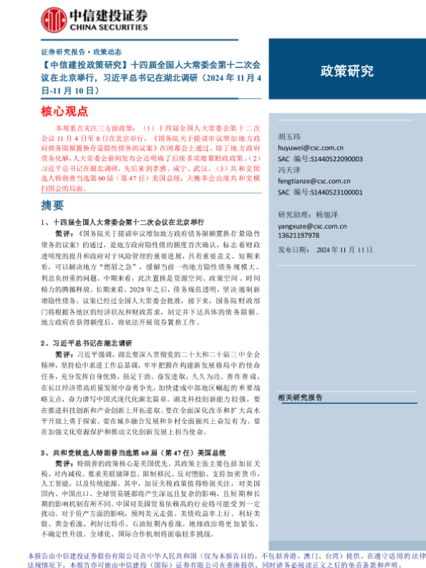 【中信建投证券】【20241125】【中信建投】政策研究-十四届全国人大常委会第十二次会议在北京举行,习近平总书记在湖北调研-15页 政策文件