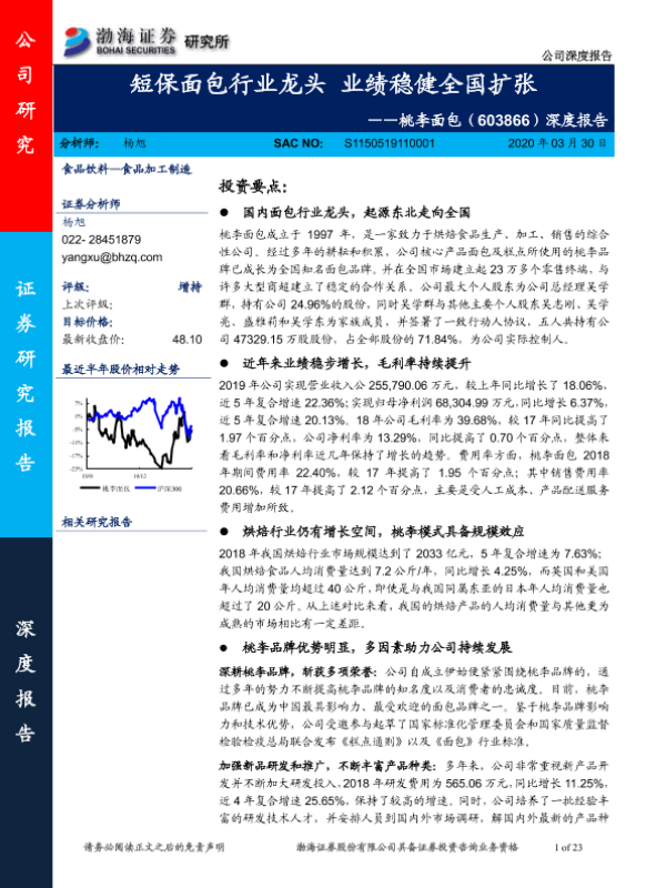 【渤海证券】【20200330】20200330-渤海证券-桃李面包-603866.SH-深度报告:短保面包行业龙头 业绩稳健全国扩张-23页 行业研究