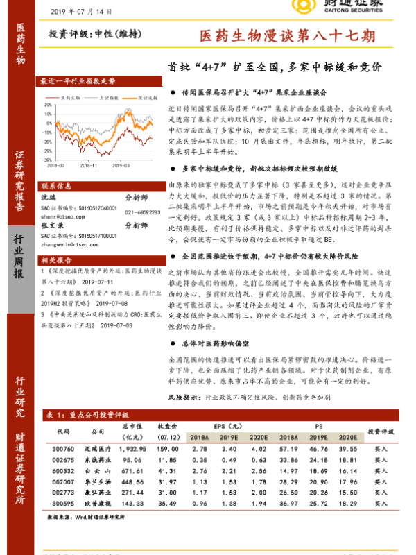 【财通证券】【20190714】医药生物漫谈第八十七期:首批“4+7”扩至全国,多家中标缓和竞价-13页 行业研究