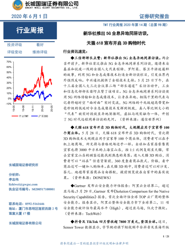 【长城国瑞证券】【20200601】TMT行业周报2020年第14期(总第98期):新华社推出5G全息异地同屏访谈,天猫618宣布开启3D购物时代-21页 行业研究