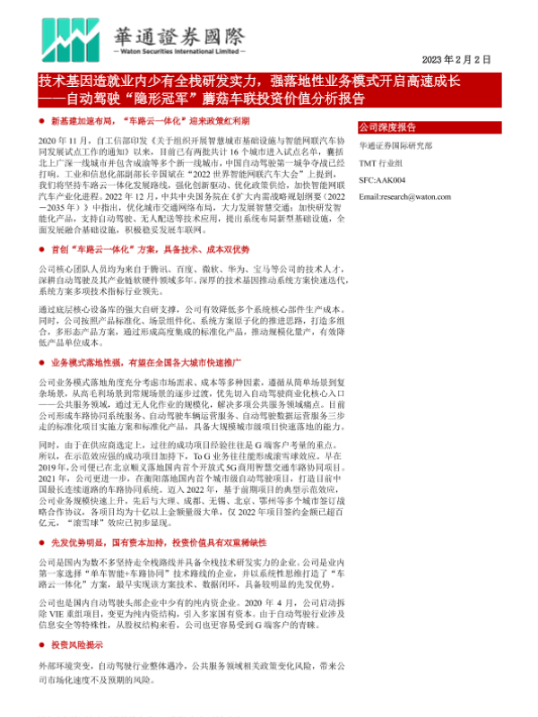 【华通证券国际】【20230202】自动驾驶“隐形冠军”蘑菇车联投资价值分析报告-47页 行业研究