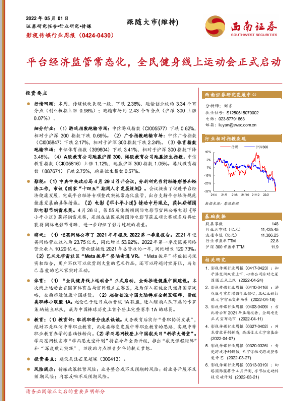 【西南证券】【20220501】影视传媒行业周报:平台经济监管常态化,全民健身线上运动会正式启动-18页 行业研究
