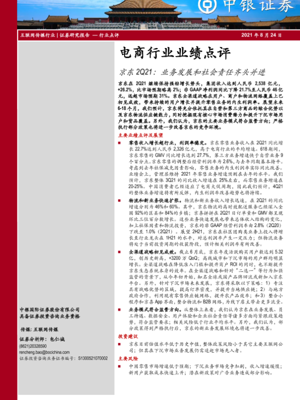 【中银证券】【20210824】电商行业业绩点评:京东2Q21:业务发展和社会责任齐头并进-3页 行业研究