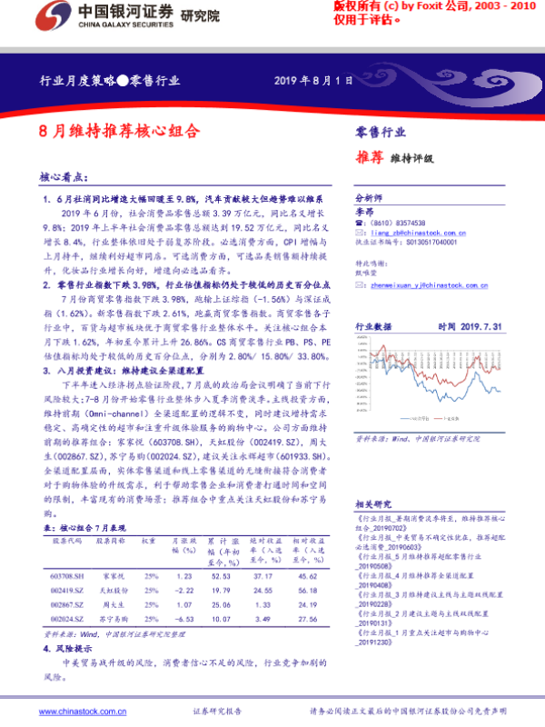 【银河证券】【20190801】零售行业:8月维持推荐核心组合-20页 行业研究