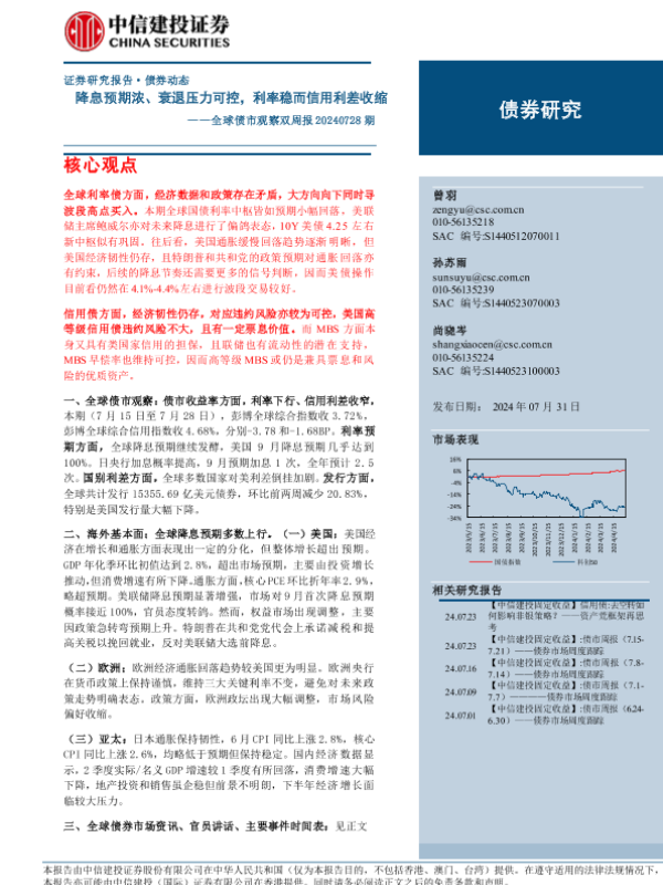 【中信建投证券】【20240731】全球债市观察20240728期:降息预期浓、衰退压力可控,利率稳而信用利差收缩-17页 行业研究