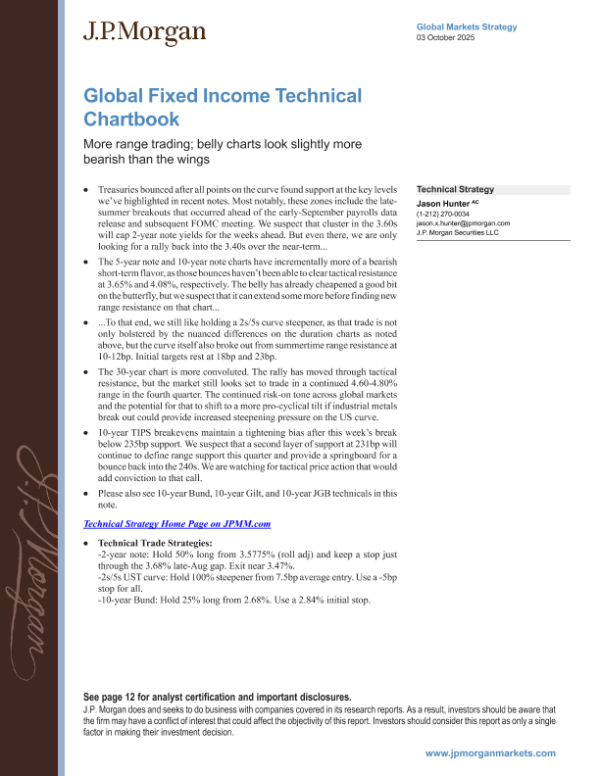 【J.P. Morgan】【202510】Global Fixed Income Technical Chartbook More range trading; belly charts look slightly more bearish than the wings-16页 证券期货研究报告