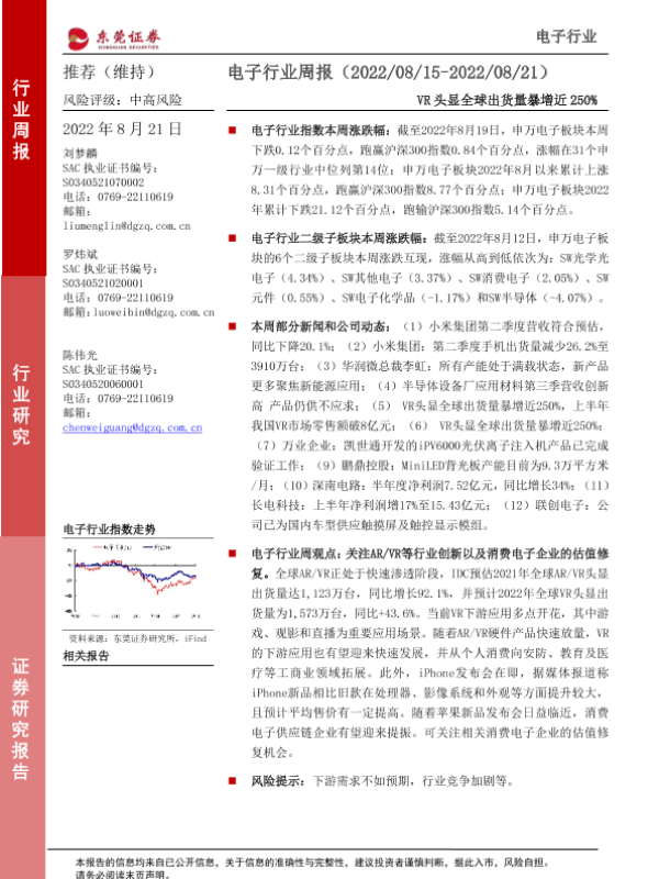 【东莞证券】【20220821】电子行业周报:VR头显全球出货量暴增近250%-14页 行业研究