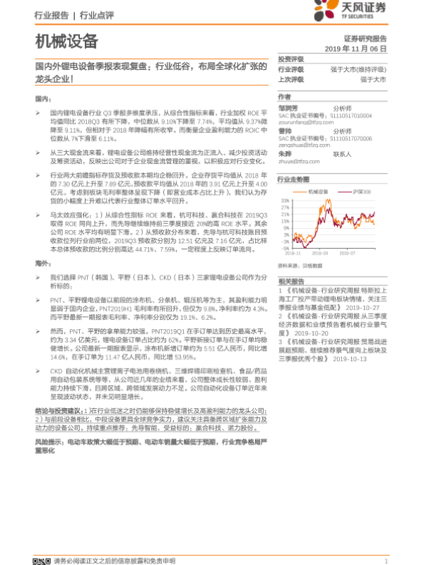 【天风证券】【20191106】20191106-天风证券-机械设备行业点评:国内外锂电设备季报表现复盘:行业低谷,布局全球化扩张的龙头企业!-14页 行业研究