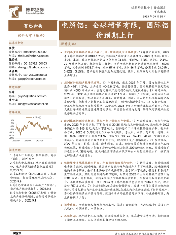 【德邦证券】【20230928】有色金属行业电解铝:全球增量有限,国际铝价预期上行-24页 行业研究