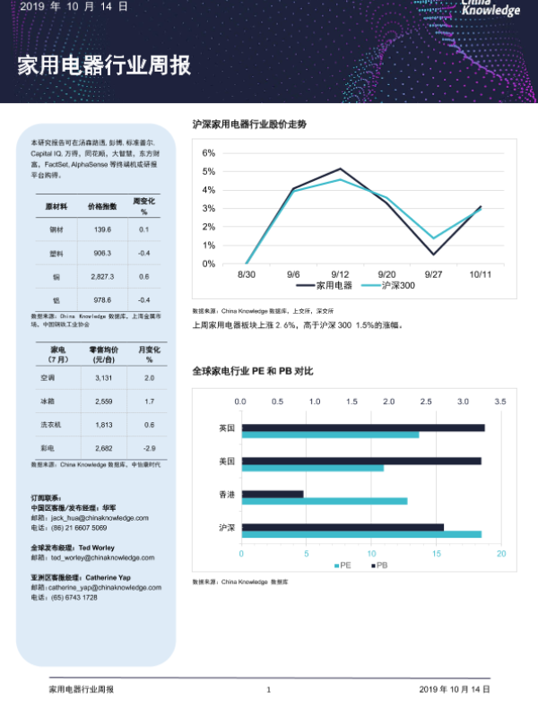 【China Knowledge】【20191014】家用电器行业周报-13页 行业研究