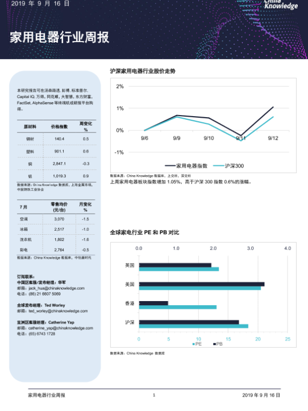 【China Knowledge】【20190916】家用电器行业周报-14页 行业研究