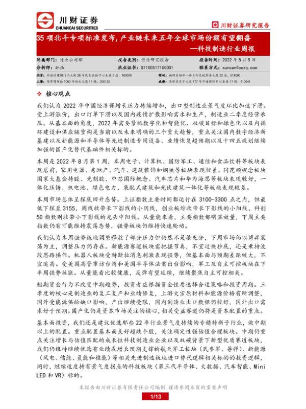 【川财证券】【20220805】20220805-川财证券-科技制造行业周报:35项北斗专项标准发布,产业链未来五年全球市场份额有望翻番-13页 行业研究