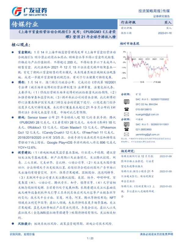 【广发证券】【20220116】传媒行业:《上海市盲盒经营活动合规指引》发布;《PUBGM》《王者荣耀》登顶21年全球手游收入榜-23页 行业研究