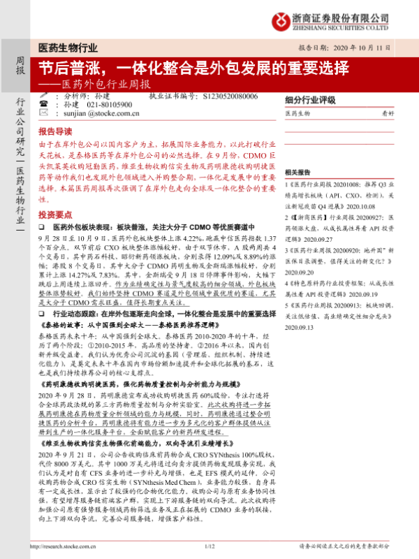 【浙商证券】【20201011】医药外包行业周报:节后普涨,一体化整合是外包发展的重要选择-12页 行业研究
