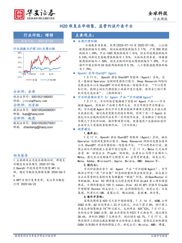 【华安证券】【20250720】全球科技行业周报:H20恢复在华销售,监管约谈外卖平台-28页 证券期货研究报告