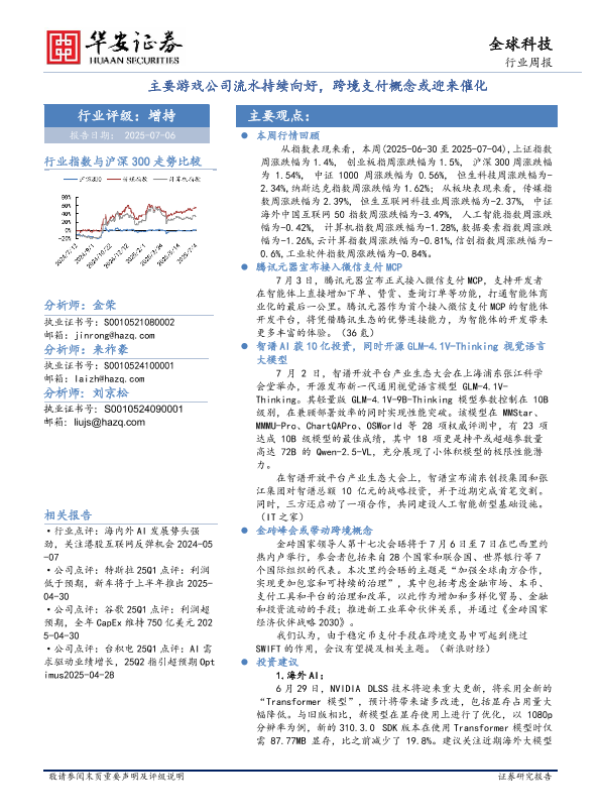 【华安证券】【20250706】全球科技行业周报_主要游戏公司流水持续向好_跨境支付概念或迎来催化-30页 证券期货研究报告
