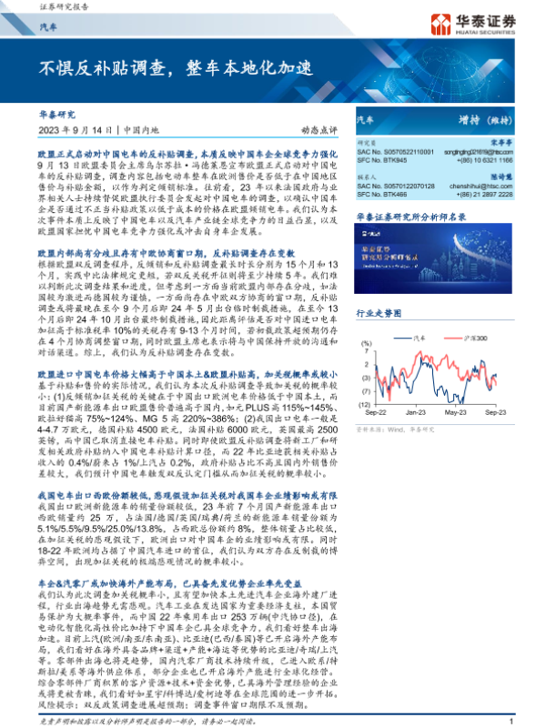 【华泰证券】【20230914】汽车动态点评:不惧反补贴调查,整车本地化加速-5页 行业研究