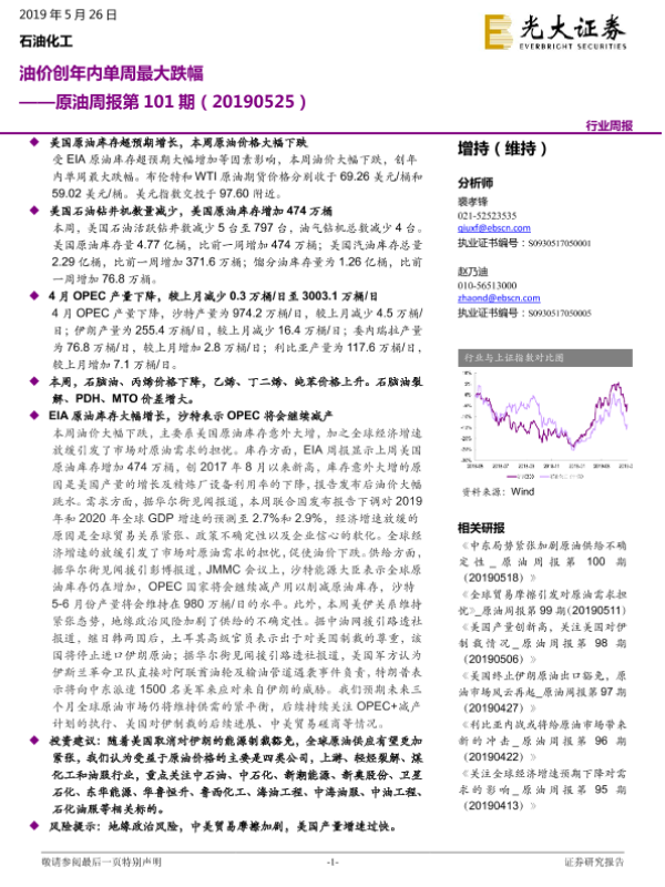 【光大证券】【20190526】原油周报第 101期:油价创年内单周最大跌幅-12页 证券期货研究报告