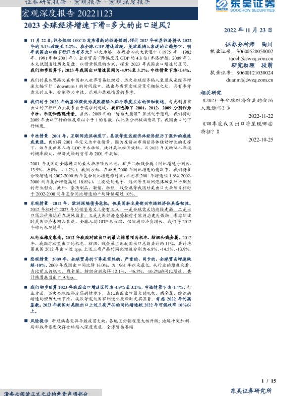 【东吴证券】【20221123】2023全球经济增速下滑=多大的出口逆风?-15页 行业研究