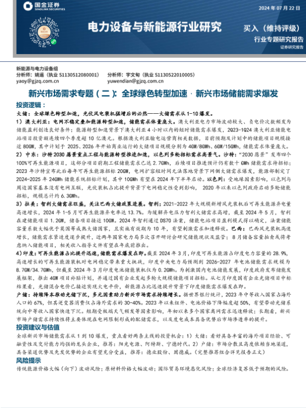 【国金证券】【20240722】电力设备与新能源行业新兴市场需求专题(二):全球绿色转型加速,新兴市场储能需求爆发-28页 行业研究