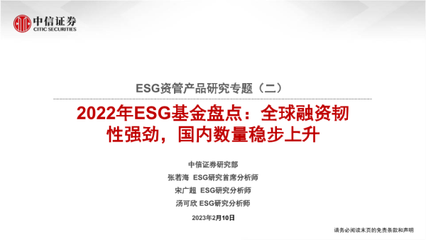 【中信证券】【20230210】ESG资管产品研究专题(二):2022年ESG基金盘点,全球融资韧性强劲,国内数量稳步上升-31页 行业研究