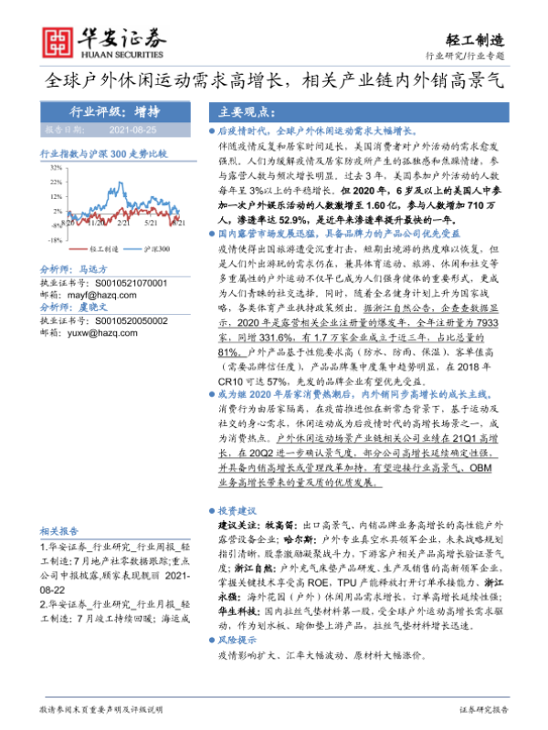 【华安证券】【20210825】轻工制造行业专题:全球户外休闲运动需求高增长,相关产业链内外销高景气-20页 行业研究