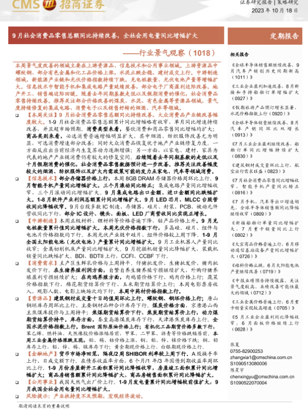 【海通证券】【20231018】行业景气观察(1018):9月社会消费品零售总额同比持续改善,全社会用电量同比增幅扩大-35页 行业研究