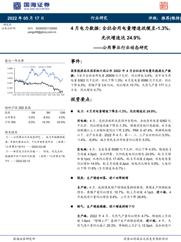 【国海证券】【20220517】4月电力数据:全社会用电量增速放缓至-1.3%,光伏增速达24.9%-11页 行业研究