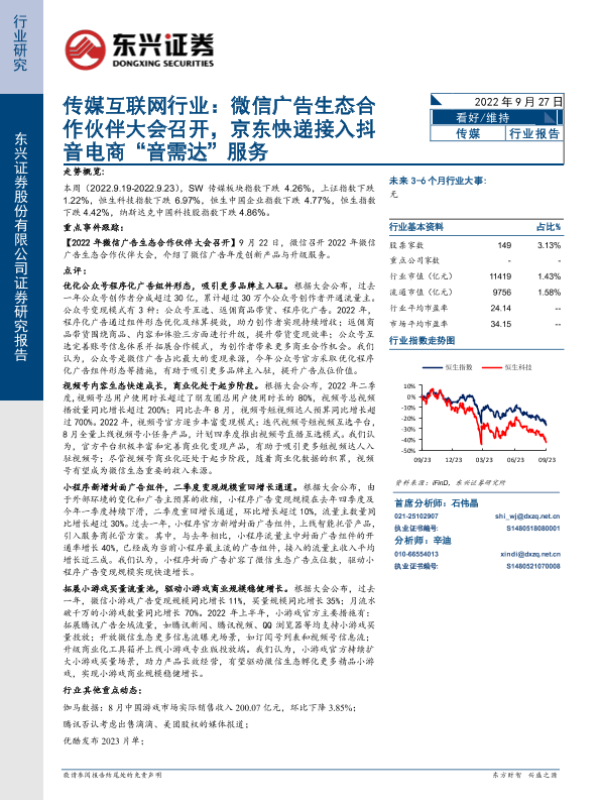 【东兴证券】【20220927】传媒互联网行业:微信广告生态合作伙伴大会召开,京东快递接入抖音电商“音需达”服务-13页 行业研究