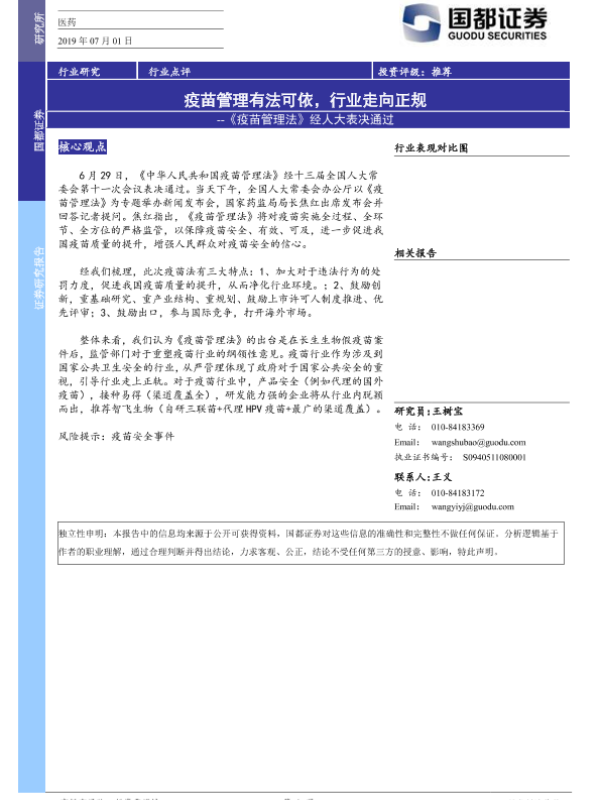 【国都证券】【20190701】《疫苗管理法》经人大表决通过:疫苗管理有法可依,行业走向正规-2页 行业研究