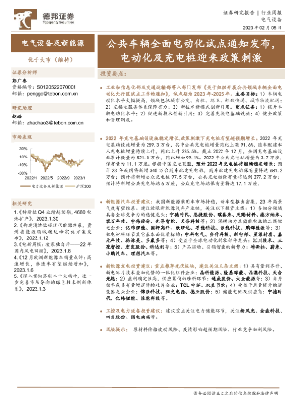 【德邦证券】【20230205】电气设备及新能源行业周报:公共车辆全面电动化试点通知发布,电动化及充电桩迎来政策刺激-14页 行业研究