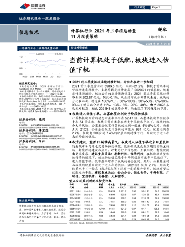 【国信证券】【20211101】计算机行业2021年三季报总结暨11月投资策略:当前计算机处于低配,板块进入估值下轨-18页 行业研究