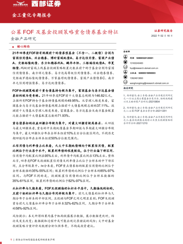 【西部证券】【20220216】金工量化专题报告:公募FOF及基金投顾策略重仓债券基金特征-20页 行业研究