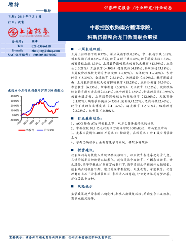 【上海证券】【20190701】20190701-上海证券-教育行业动态:中教控股收购南方翻译学院,科斯伍德整合龙门教育剩余股权-8页 行业研究