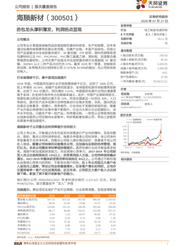 【天风证券】【20200727】20200727-天风证券-海顺新材-300501.SZ-药包龙头厚积薄发,利润拐点显现-21页 行业研究